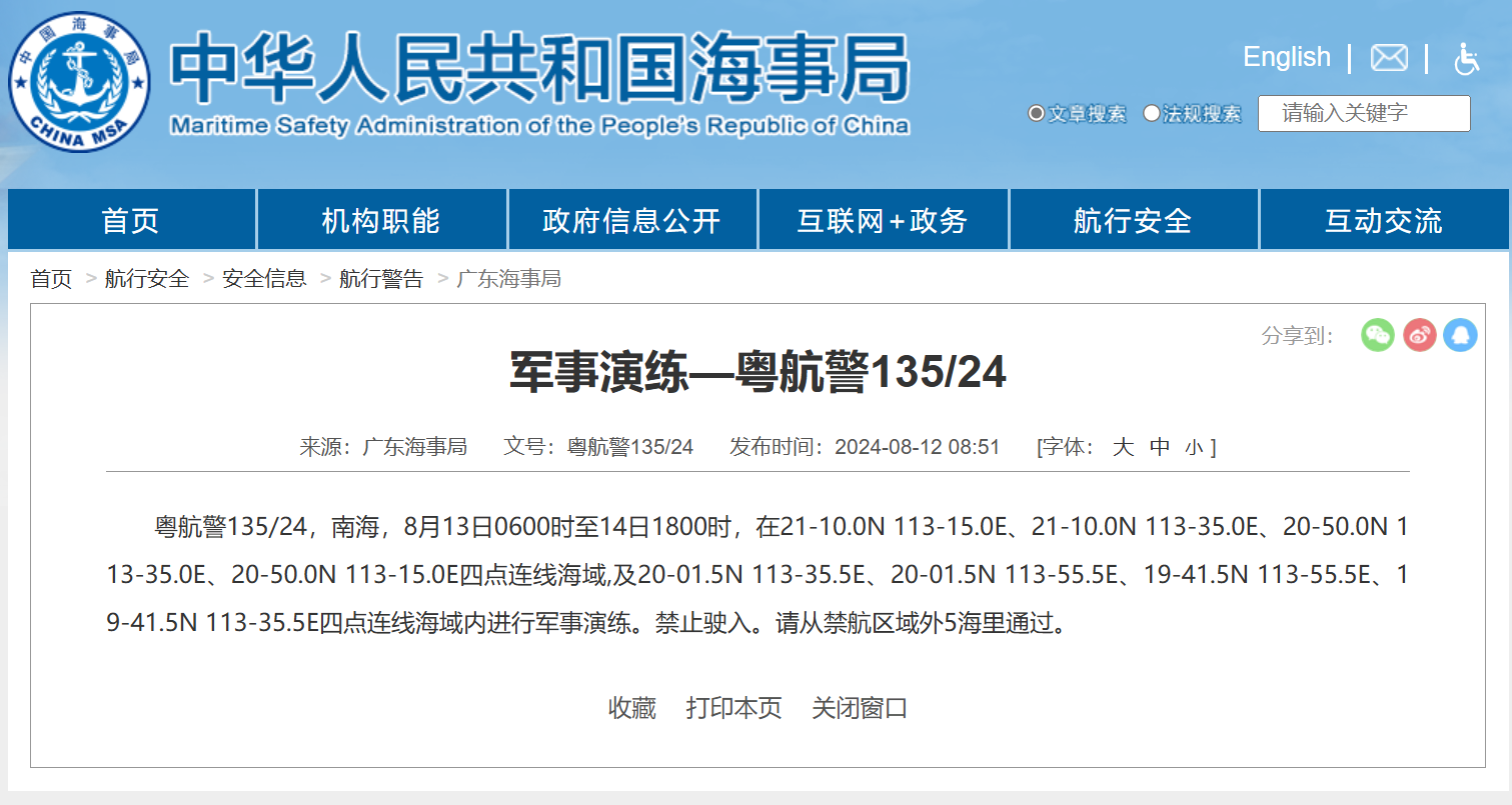 据中国海事局网站消息,广东海事局发布航行警告,8月13日6时至14日18时,南海部分海域进行军事演练,禁止驶入。