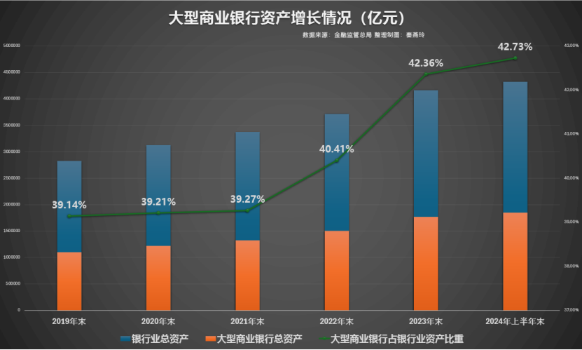 从资产端来看,今年上半年,银行业集中度进一步上升。2024年二季度末,我国银行业金融机构本外币资产总额433.1万亿元,同比增长6.6%。其中,大型商业银行本外币资产总额185.1万亿元,同比增速快于行业平均水平,达到7.9%,占银行业的资产比重也增加至42.73%。