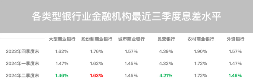 分机构类型来看,股份制商业银行截至二季度末的净息差水平环比一季度末略提高至1.63%,一季度末这一数据为1.62%。