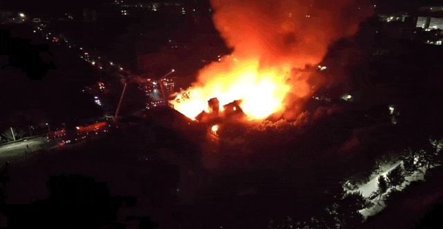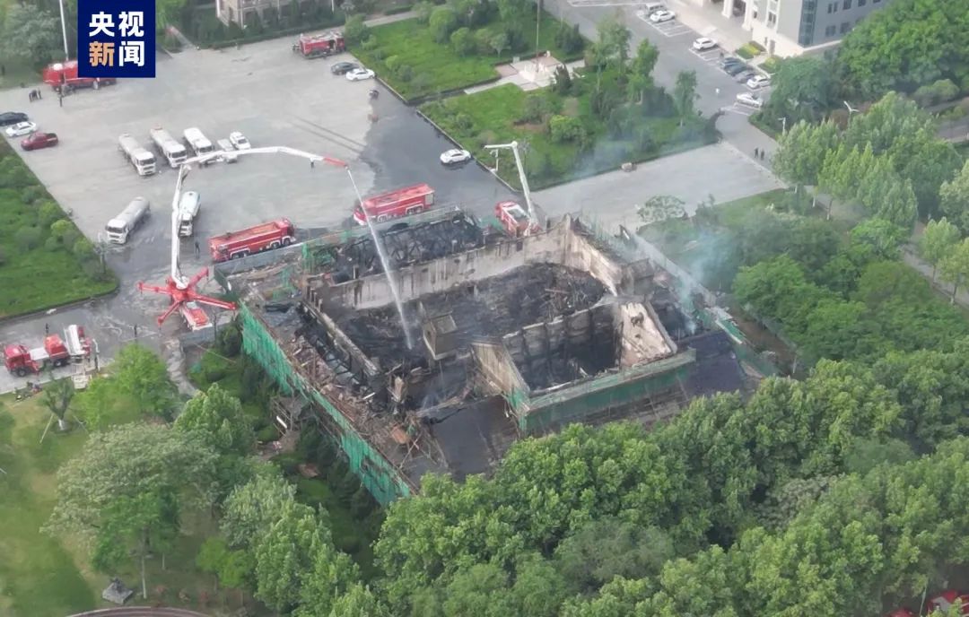 根据最新图片显示,大礼堂房顶基本坍塌,被火烧过的外墙一片焦黑,只剩下绿色安全隔离网。
