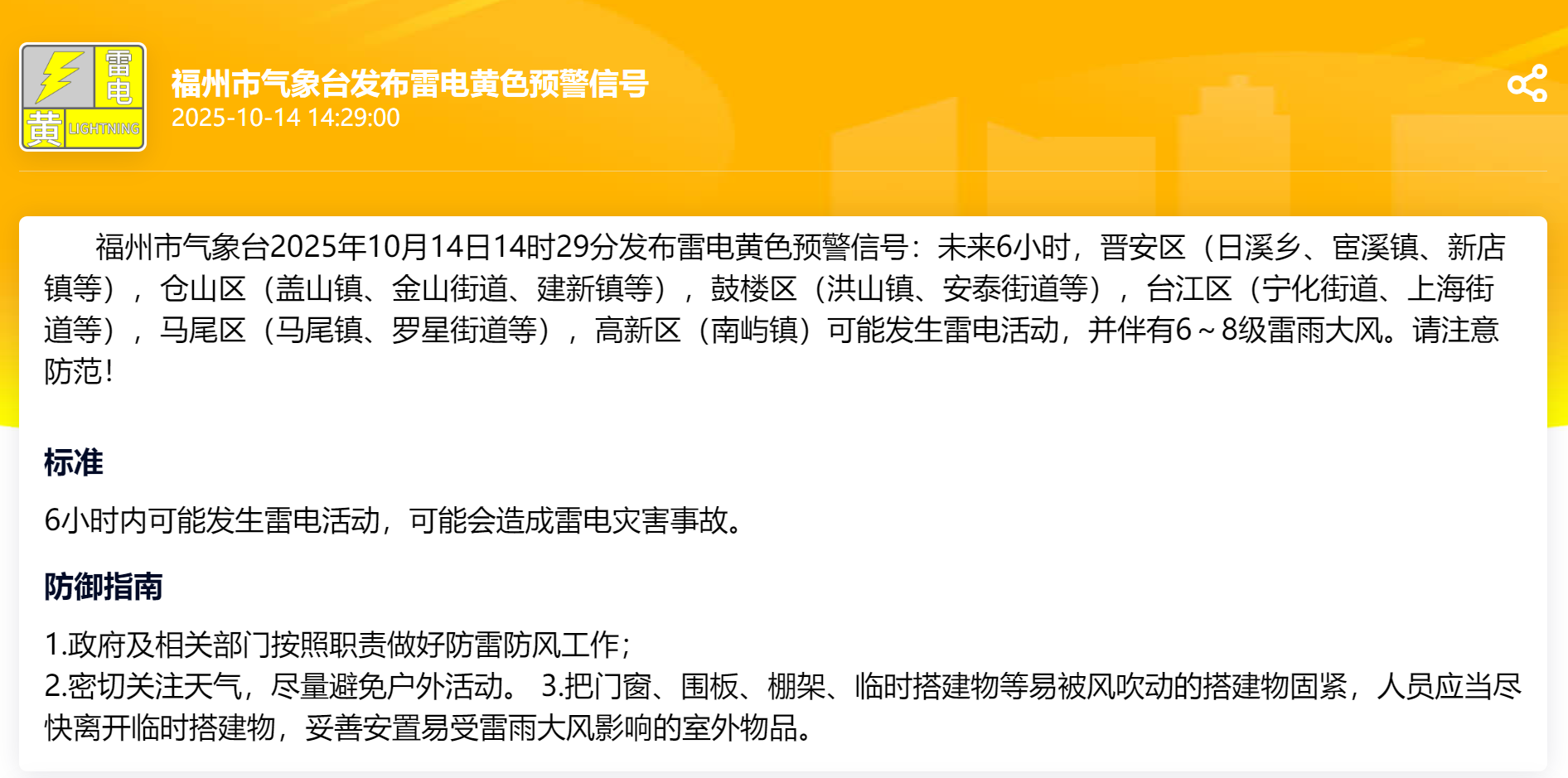 福州市气象台2025年10月14日14时29分发布雷电黄色预警信号:未来6小时,晋安区(日溪乡、宦溪镇、新店镇等),仓山区(盖山镇、金山街道、建新镇等),鼓楼区(洪山镇、安泰街道等),台江区(宁化街道、上海街道等),马尾区(马尾镇、罗星街道等),高新区(南屿镇)可能发生雷电活动,并伴有6~8级雷雨大风。请注意防范!