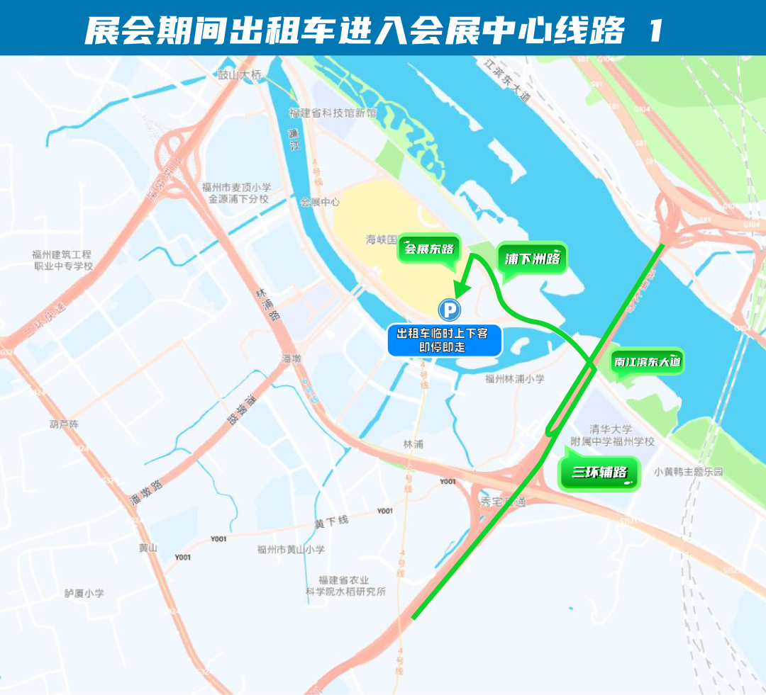 3、南江滨西大道(上渡、仓前、连江路方向)来的车辆可由南江滨西大道——会展西路——会展西路出租车下车点。