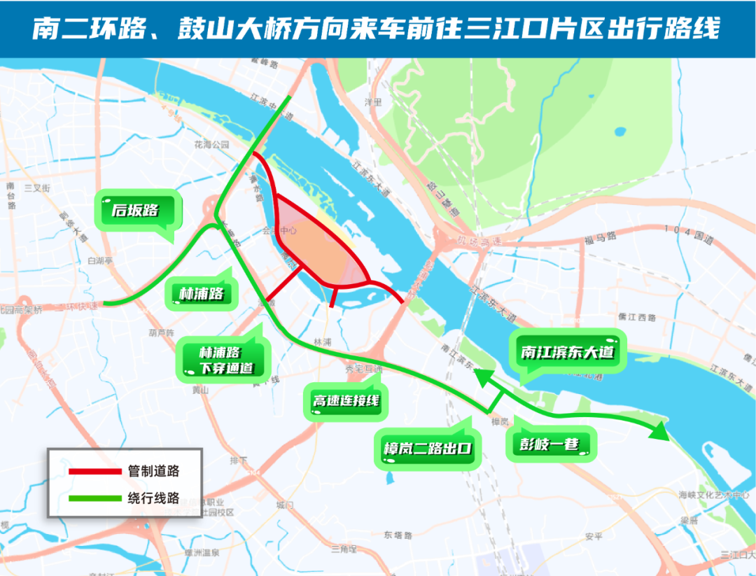 南二环路、鼓山大桥方向往来的车辆:可由后坂路——林浦路——林浦路下穿通道——高速连接线——樟岚二路出口——高速连接线辅路——彭岐一巷——南江滨东大道行驶——前往三江口片区的金沙公园、梁厝街区等地。