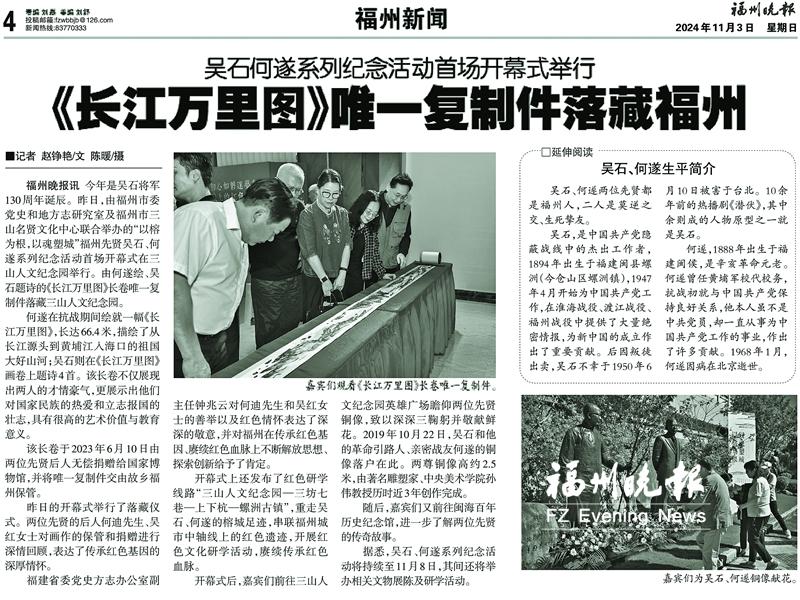 2024年是吴石将军130周年诞辰。福州市委党史和地方志研究室及福州市三山名贤文化中心联合举办了吴石、何遂系列纪念活动。福州晚报对此进行了报道。活动中,《长江万里图》与众多福州市民见面。人们进一步了解两位先贤的传奇故事,瞻仰两位先贤的铜像。