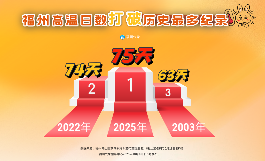 18日福州主城区鼓楼乌山国家站气温达35.5℃,标志着福州出现今年第75个高温日,同时也是本月的第11个高温日,刷新了省会级城市历史最晚高温日纪录(原纪录为10月14日,出现在1964年的南宁),同时也刷新了福州1951年建站以来最多高温日纪录(原纪录2022年74天)。此外,19日为本年度最后一个高温日。