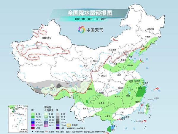 后天(30日),西藏中东部、川西高原等地部分地区有小雪或雨夹雪,其中,西藏中部等地局部地区有中到大雪。辽宁东部和南部、西藏东部、华北南部、黄淮东部、江淮大部、江南、西南地区东部、广西、海南岛、台湾岛等地部分地区有小到中雨,其中,海南岛东部等地部分地区有大雨。