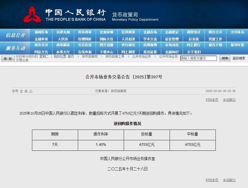 据中国人民银行官网消息,2025年10月28日中国人民银行以固定利率、数量招标方式开展了4753亿元7天期逆回购操作。