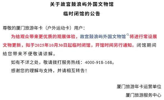 近日,故宫鼓浪屿外国文物馆发布临时闭馆公告:为给观众带来更优质的观展体验,故宫鼓浪屿外国文物馆将进行常设展文物更新,拟于2025年10月30日起临时闭馆,开馆时间另行通知。