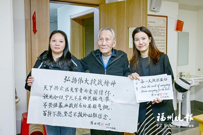 在福州万颐智汇坊居家养老照料中心,陈世明生活有序,精神饱满。他每天坚持到楼下广场散步、练手指操、呼吸新鲜空气;每周四上午在三楼练习楷书,笔力遒劲、气韵生动。7年来,他用中英文书写红色条幅逾千字,赠与来访者,以笔墨传递信念与祝福。