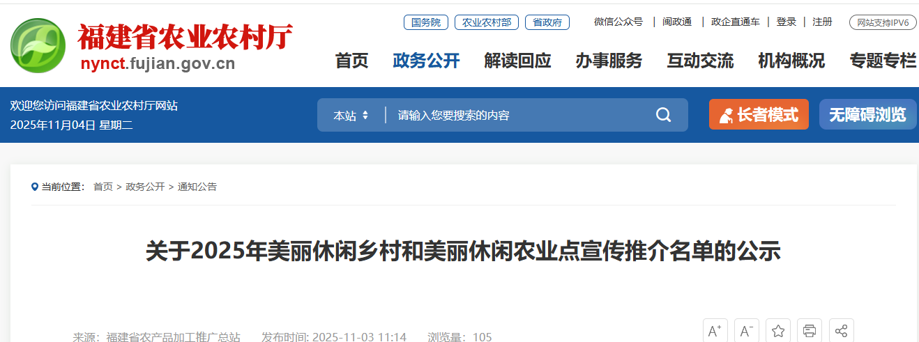 福建省农业农村厅最新公示拟遴选45个美丽休闲乡村、14个美丽休闲农业点,公示时间:11月3日至11月7日。