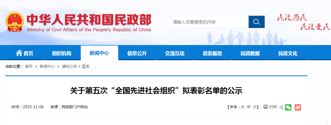 根据《民政部关于开展第五次全国先进社会组织评比表彰活动的通知》(民函〔2025〕22号)要求,经申报、评审、征求意见等环节,形成第五次“全国先进社会组织”拟表彰名单,现予公示。