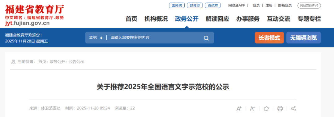 最新!福建省教育厅发布关于推荐2025年全国语言文字示范校的公示,拟推荐福建师范大学等12所学校申报“2025年全国语言文字示范校”,一起来看——