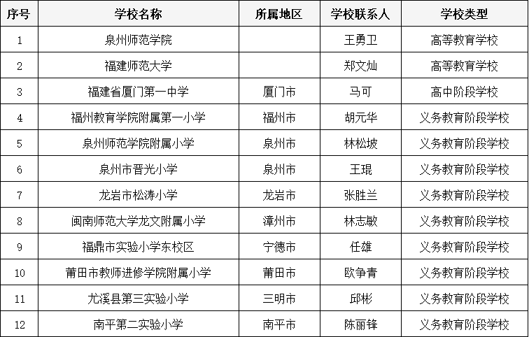 根据《教育部办公厅关于开展全国示范性特色学校创建的通知》相关要求,经各地市教育部门推荐和相关高校申报,结合近年来各地各校语言文字工作情况和对申报材料的严格审核,拟推荐福建师范大学等12所学校申报“2025年全国语言文字示范校”,现将推荐名单予以公示。