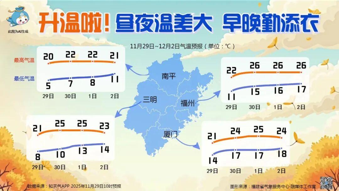 在下一股冷空气到来之前,福州市区的高温都在20℃以上,白天有阳光的助力,体感上还是较为舒适的,但是昼夜温差大,早晚时段要注意添衣保暖,预防感冒。