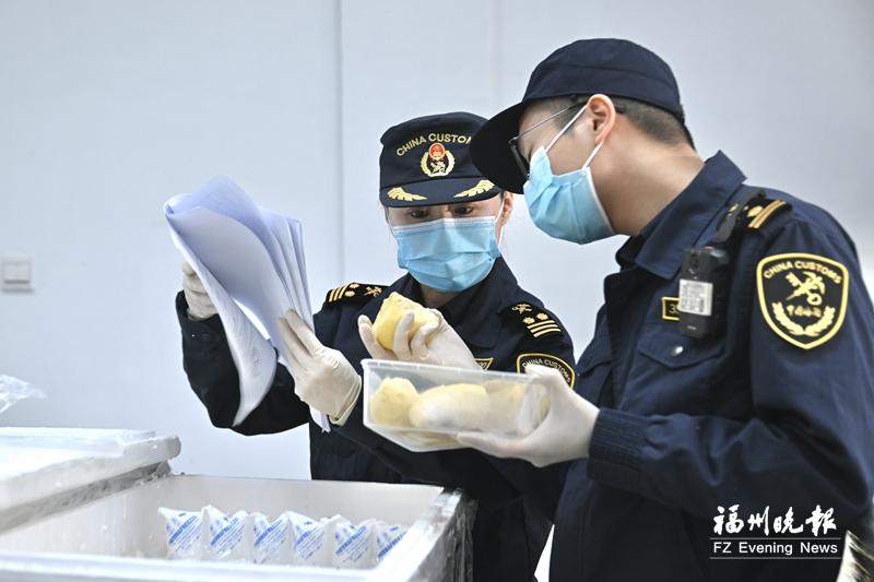 福州海关工作人员对印尼冷冻榴莲进行开箱查验。