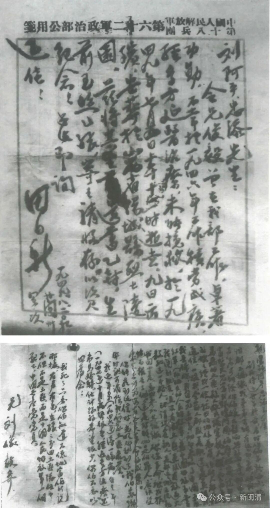 (上)中国人民解放军第六十二军政治部主任田日新给刘俊毅家属的信;(下)刘俊毅遗书