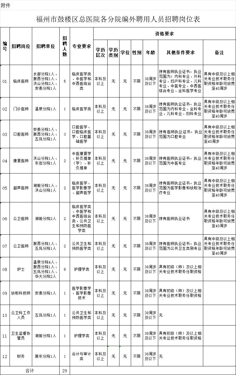 福州市鼓楼区总医院招聘编外聘用人员29人