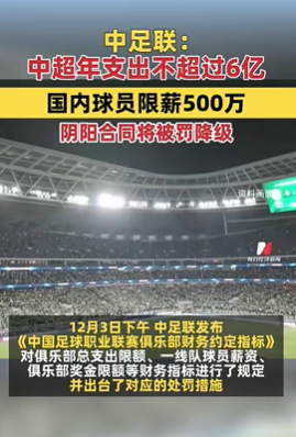 12月3日,中国足球职业联赛联合会发布《关于印发中国足球职业联赛俱乐部财务约定指标的通知》,明确了球员个人薪酬限额。