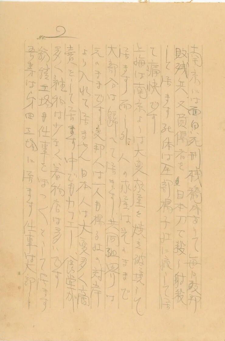 “南京有一座很有意思的死刑栈桥,每天都在用日本刀斩杀或射杀中国败残兵或伤兵,并且把尸体全部抛入扬子江冲走,真痛快”,这是侵华日军国崎支队步兵第四十一联队士兵村田芳夫于1938年1月8日写给父亲的信件,共4页,用铅笔书写,系纪念馆从日本学者渡边久志处征集。