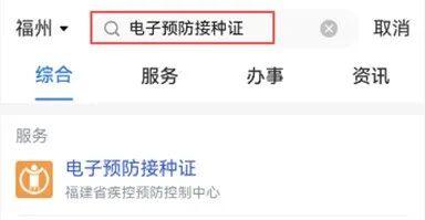 入口一:“闽政通”APP中,点击页面的“个人办事”,选择“卫生健康”中的“电子预防接种证”。也可以在首页上方搜索框内搜索“电子预防接种证”后,点击登录。