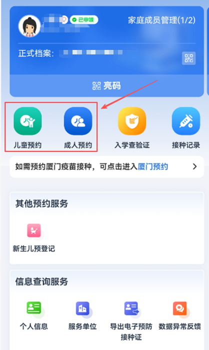 在电子预防接种证功能页面点击“儿童预约”或“成人预约”,进入预约页面后,可以预约儿童或成人需要接种的疫苗。