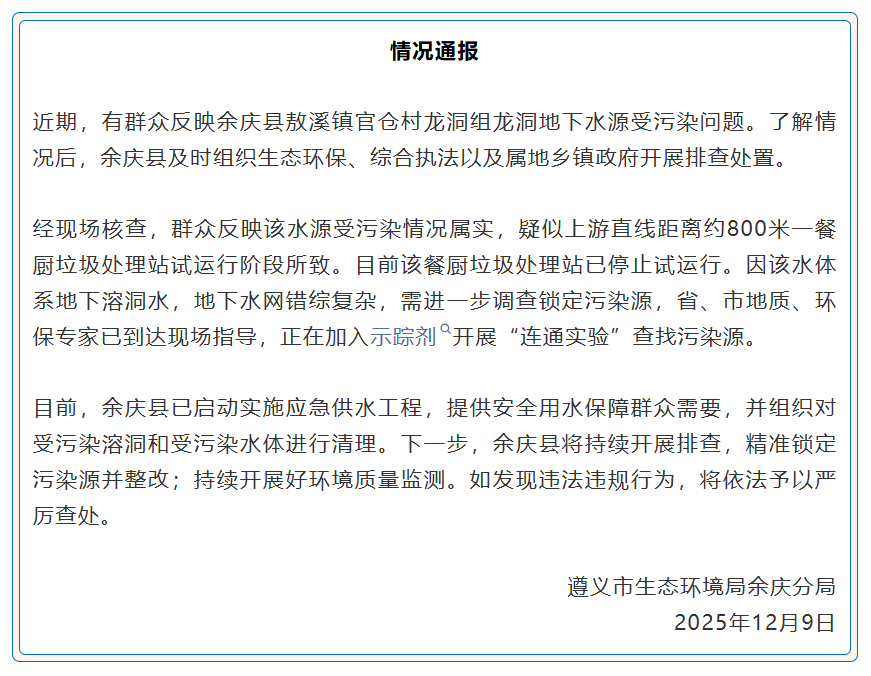 目前,余庆县已启动实施应急供水工程,提供安全用水保障群众需要,并组织对受污染溶洞和受污染水体进行清理。下一步,余庆县将持续开展排查,精准锁定污染源并整改;持续开展环境质量监测。如发现违法违规行为,将依法予以严厉查处。