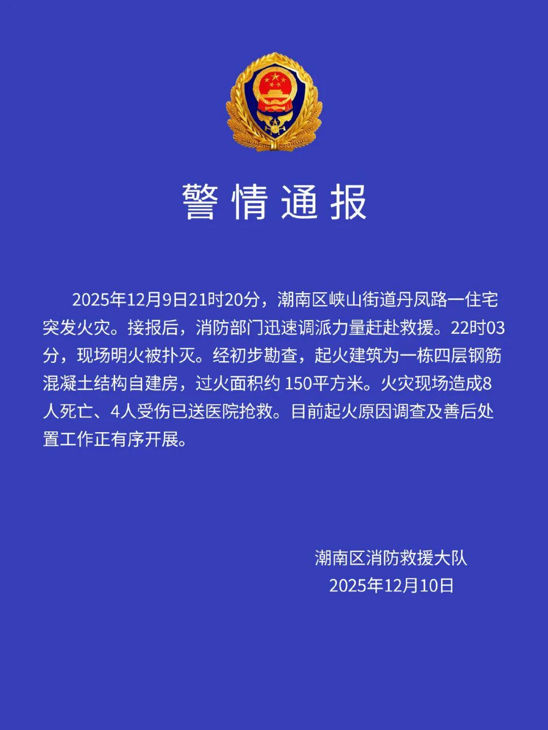 通报称,接报后,消防部门迅速调派力量赶赴救援。22时03分,现场明火被扑灭。经初步勘查,起火建筑为一栋四层钢筋混凝土结构自建房,过火面积约150平方米。火灾现场造成8人死亡、4人受伤已送医院抢救。目前起火原因调查及善后处置工作正有序开展。