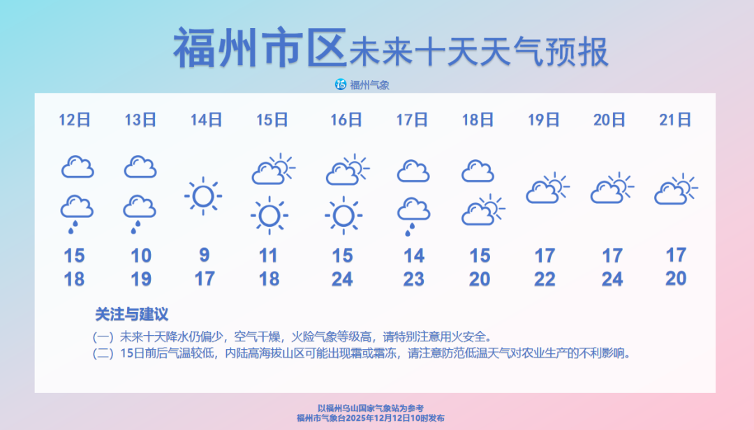 未来十天福州大部分时段仍以多云天气为主,降水继续偏少。12日起冷空气逐渐影响福州,气温逐渐下降,14日~16日夜晨气温较低,高海拔山区局部有霜冻。具体天气趋势如下: