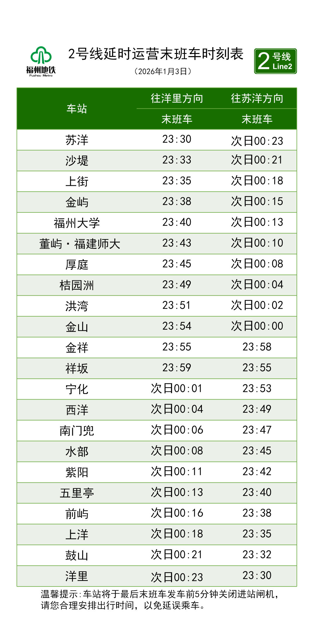 2026年1月3日,1号线、2号线、4号线、5号线、6号线、滨海快线运营末班车延至23:30始发。延时运营期间,各线路行车间隔为15分钟。2026年1月1日、2日运营时间保持不变。
