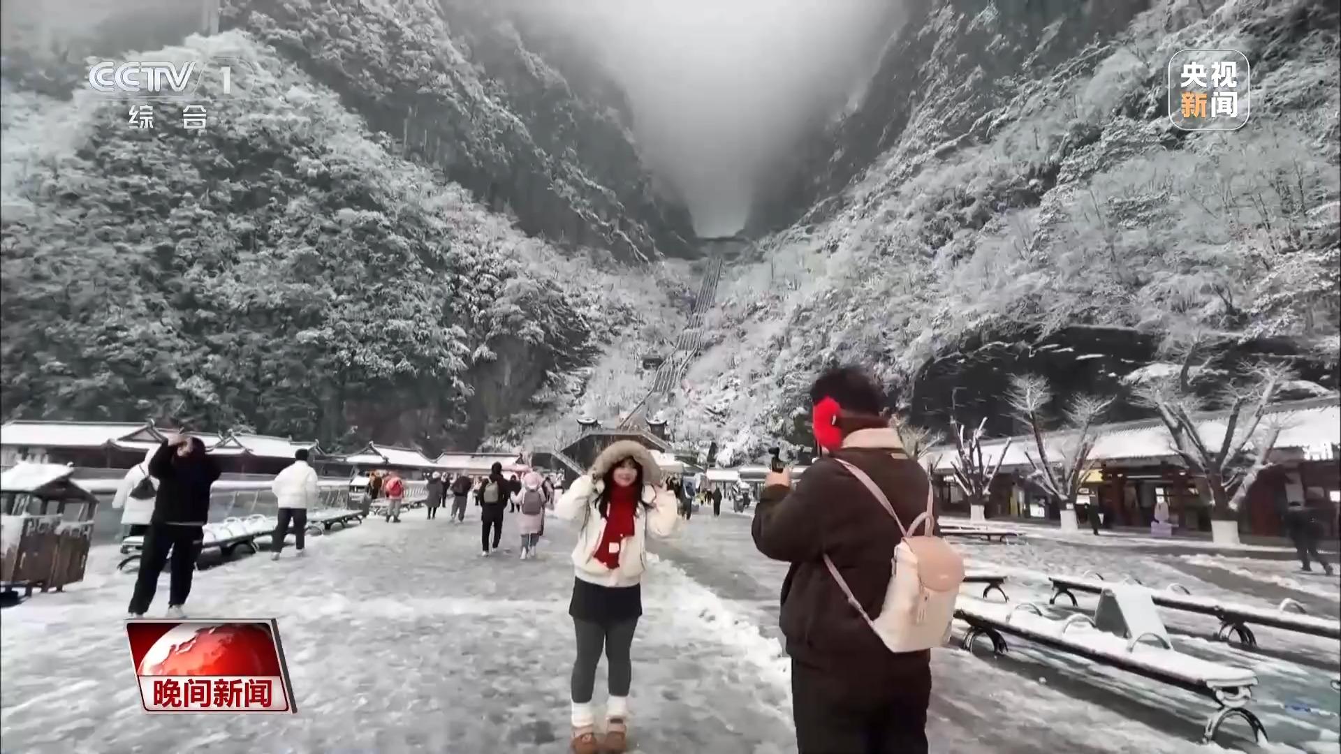 在湖南张家界天门山景区,洁白的积雪与苍翠的林木、峻峭的山峰交相辉映,构成一幅壮丽的冰雪画卷。标志性景点天门洞也被冰雪装点,巨大的天然穿山溶洞在白雪与云雾的衬托下,更显磅礴气势。
