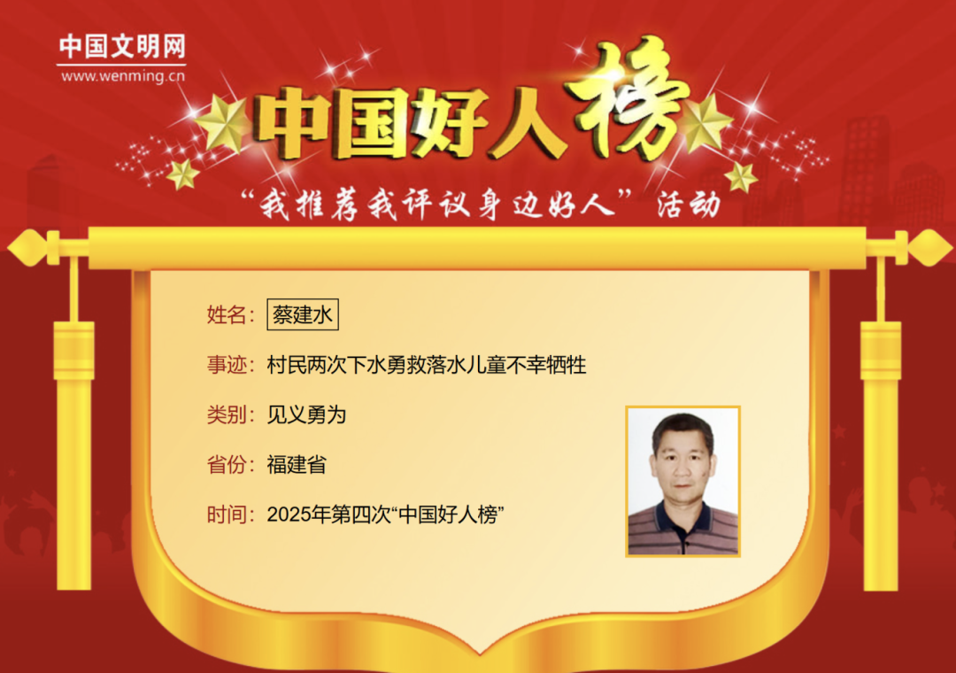 蔡建水,男,1968年3月生,生前系福建省漳州市云霄县下河乡下河村村民。2025年8月4日下午,一名孩童失足落水,情况危急,蔡建水挺身而出,两度跃入湍急河流奋力施救。最终,落水儿童成功获救,蔡建水却因体力不支被暗流吞噬,不幸遇难。