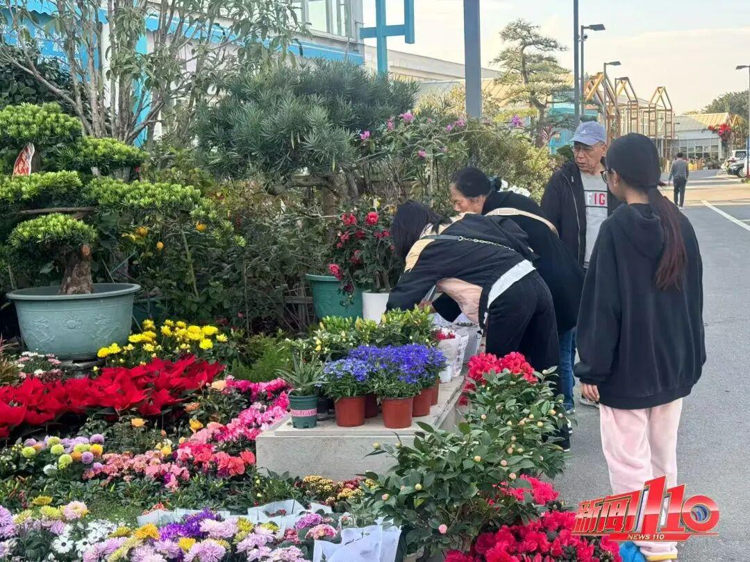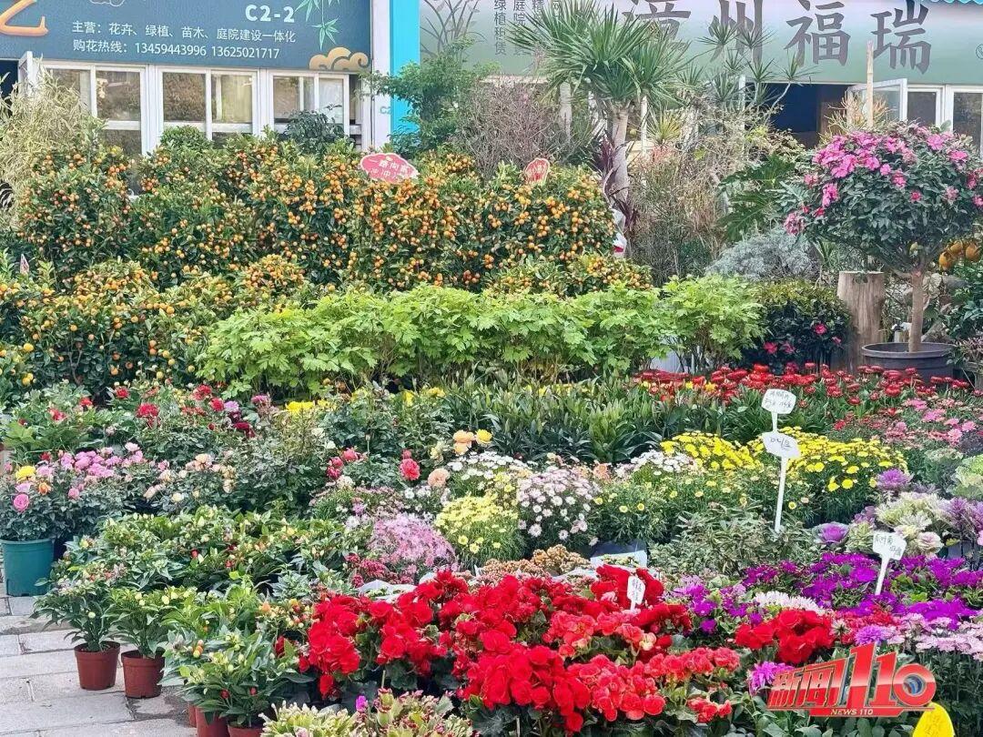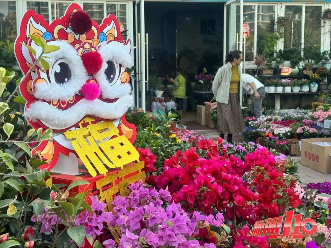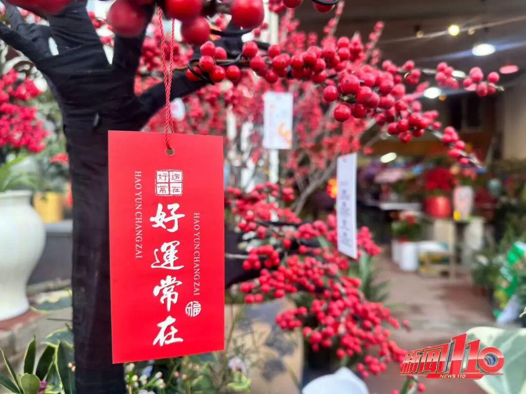 蝴蝶兰的优雅,冬青的热烈,金桔的饱满,和张灯结彩的店铺相映成趣,浓郁的年味扑面而来。