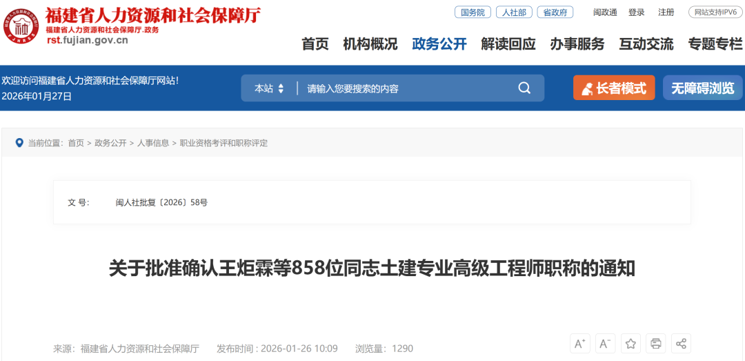 《福建省住房和城乡建设厅关于报请批准确认王炬霖等858人土建系列高级职称的函》(闽建人函〔2026〕3号)悉。经研究,批准确认由2024年度福建省工程技术专业人员土建专业高级职称评审委员会评审通过的王炬霖等858位同志土建专业高级工程师职称,任职资格确认时间为2025年12月18日,现予公布。