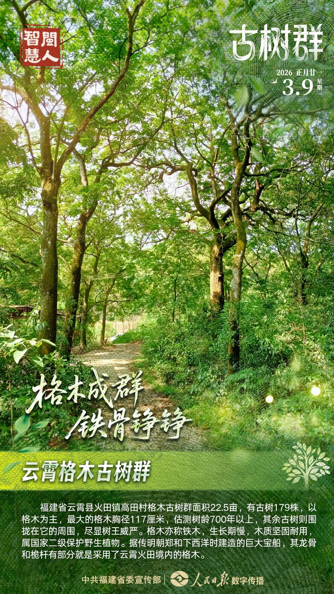 福建省云霄县火田镇高田村格木古树群面积22.5亩,有古树179株,以格木为主,最大的格木胸径117厘米,估测树龄700年以上,其余古树则围拢在它的周围,尽显树王威严。格木亦称铁木,生长期慢,木质坚固耐用,属国家二级保护野生植物。据传明朝郑和下西洋时建造的巨大宝船,其龙骨和桅杆有部分就是采用了云霄火田境内的格木。