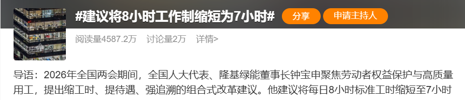 2026年全国两会期间,全国人大代表、隆基绿能董事长钟宝申聚焦劳动者权益保护与高质量用工,提出缩工时、提待遇、强追溯的组合式改革建议。