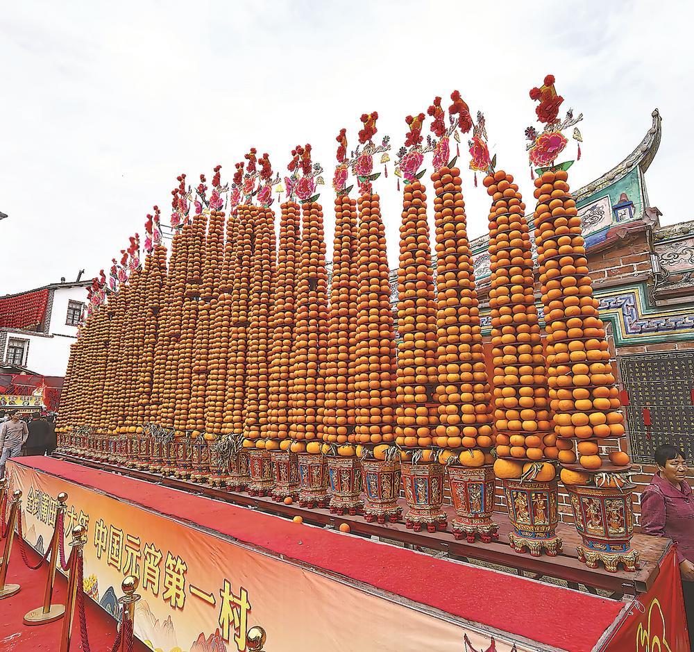 莆田市黄石镇江东村元宵节垒红桔塔,这一祀典祭品于2022年被列入福建省非物质文化遗产代表性项目名录。记者 刘志雄 摄