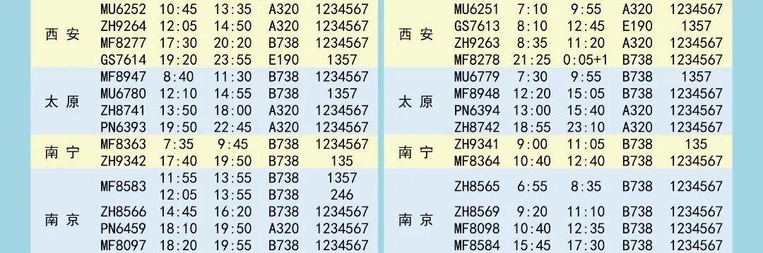 夏航季航班时刻表如下↓